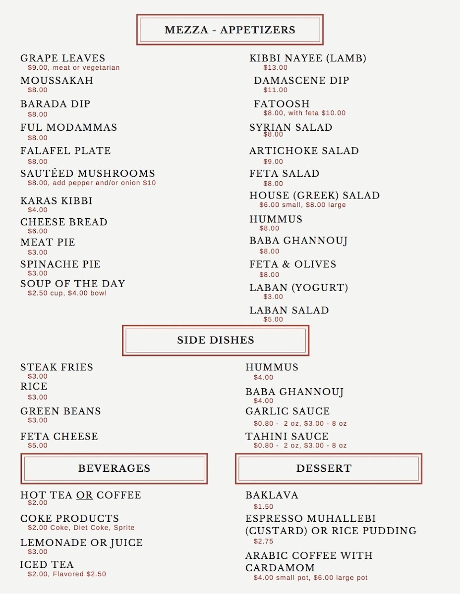 Grape leaves, meat pie, shish kafta and fried kibbi, served with rice or steak fries and hummus.